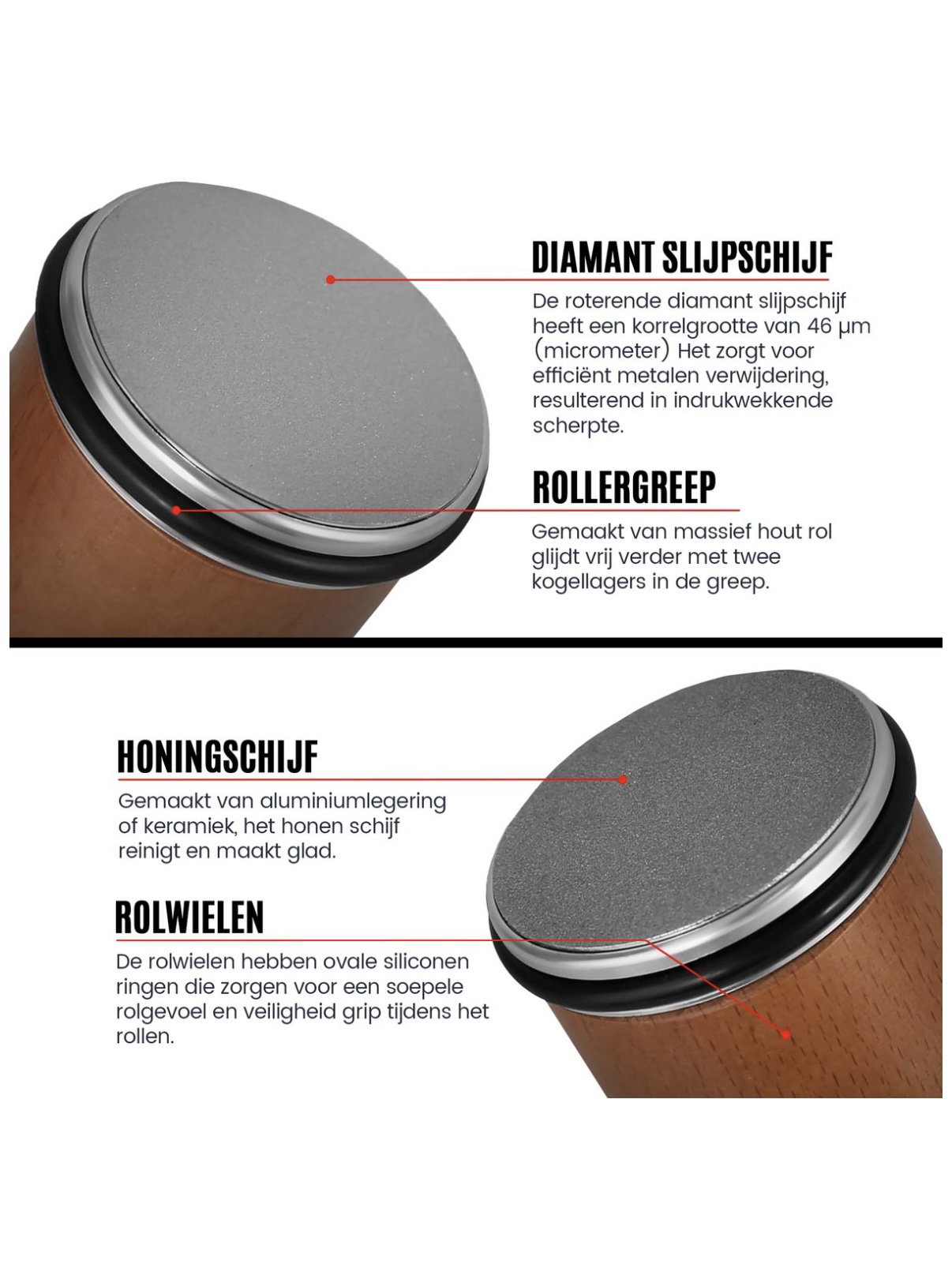 De Aventra rollende messenslijper. Dit onmisbare keuken accessoire zorgt ervoor dat uw messen razendsnel en moeiteloos vlijmscherp zijn, waardoor je elke maaltijd bereiding meer tijd kan besparen. Ook bespaar je het aanschaffen van nieuwe messen, door altijd je messen scherp te houden met de Aventra rollende messenslijper. Met zijn unieke combinatie en houten design biedt deze messenslijper ongekende gebruiksgemak.